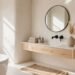 Accessories stay tonal—stone soap dish, amber glass bottle, and a linen hand towel. Add a teak stool by the shower and a single branch in a minimalist vase. Replace metal drain covers and hardware with matching finishes for cohesion.
