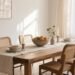 Add matte stainless hardware, a soft-beige linen shade on a mini table lamp tucked in the corner, and a terracotta-toned runner. A couple of olive wood boards and a carafe with amber glass finish the earthy, airy vibe.