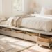 This room feels like a warm breeze through gauzy curtains. Start with **creamy walls**, a **natural jute rug**, and a **low-profile platform bed** in light oak. Keep the palette soft: **sand, ivory, oat, and warm taupe**.